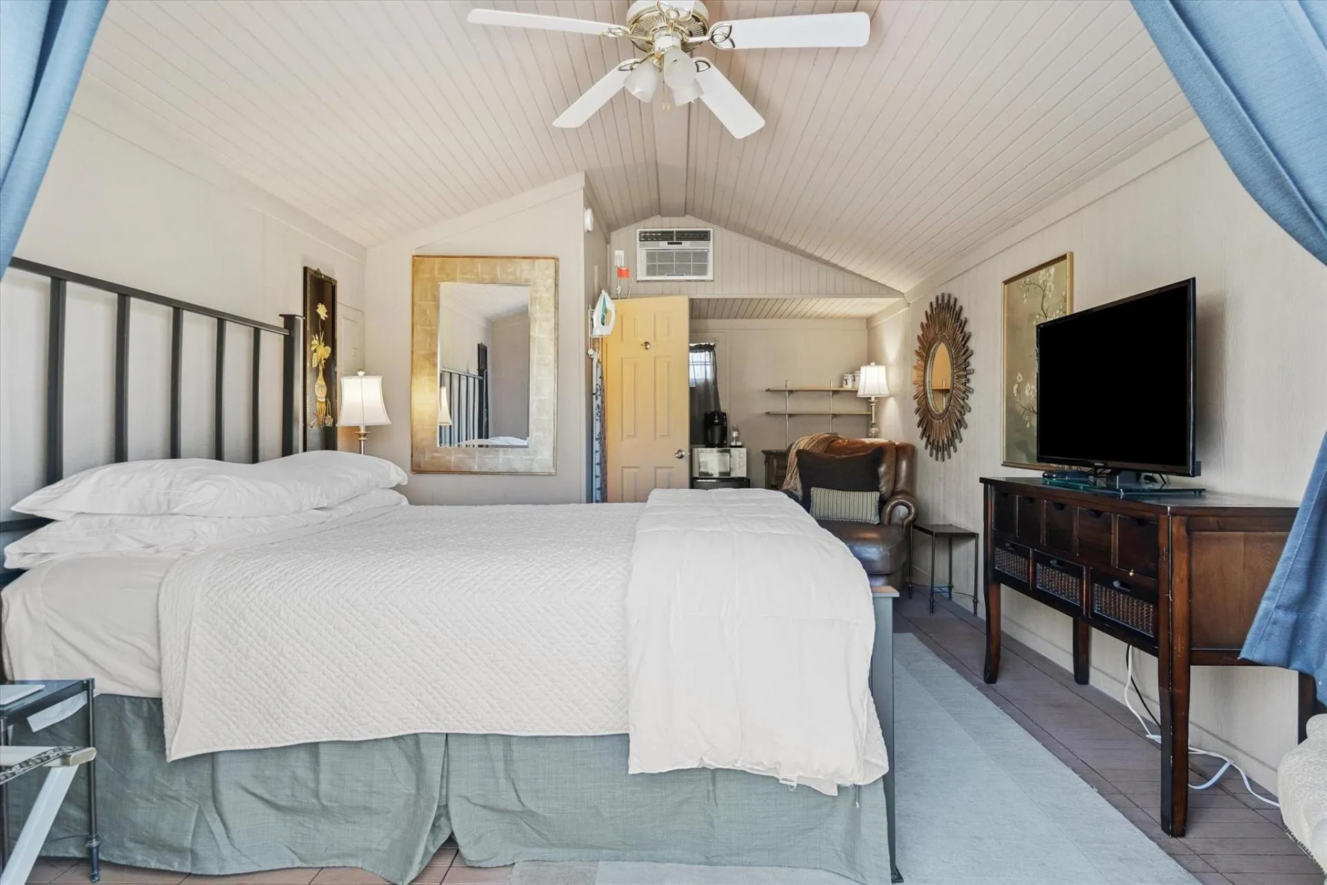 Burke Trammel Cottage is a standalone guest space on the same residential property as the main Victorian home at 317 W Sam Rayburn Dr — but separate from it. Private entrance, private porch, queen bed, private bath, Wi-Fi, and a streaming TV. Come and go on your own schedule without coordinating around anyone else.